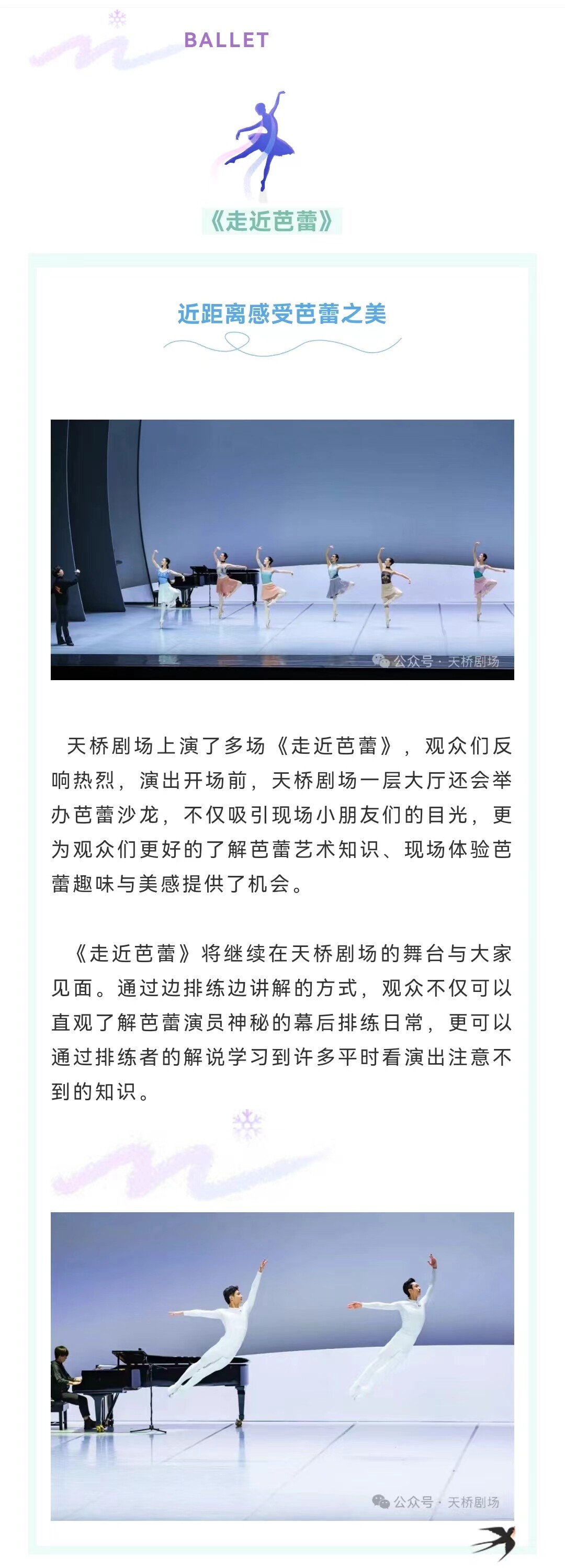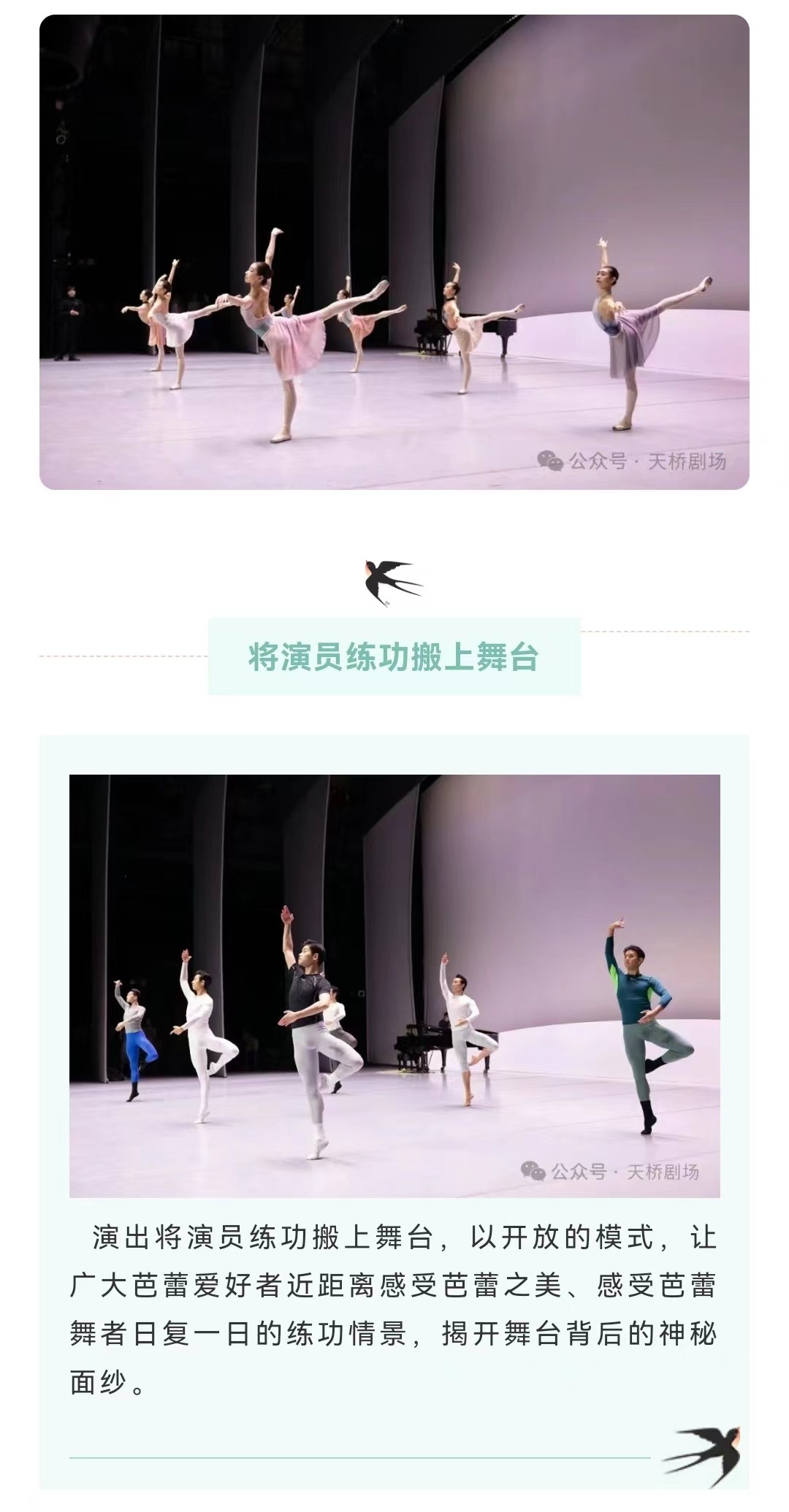 中央芭蕾舞团(又:中国国家芭蕾舞团)成立于1959年12月。演职员均由专业院校培养的一流艺术人才汇集而成。在社会各界的关心支持下,剧团在俄罗斯学派的坚实基础之上,不断汲取各不同流派不同风格之特长,在引进排演了《天鹅湖》《堂·吉诃德》《吉赛尔》《卡门》《奥涅金》《火鸟》《小美人鱼》《舞姬》《灰姑娘》《珠宝》等大量的世界经典名作外,自创了《红色娘子军》《祝福》《黄河》《大红灯笼高高挂》《牡丹亭》《过年》《鹤魂》《敦煌》《九色鹿》《花一样开放》《沂蒙》《世纪》《红楼梦》《欢乐颂·星海璀璨》《十二生肖》等一大批极具鲜明民族特色的精品佳作,成功探索出一条古典与现代、民族与世界完美融合的中国芭蕾艺术发展创作之路。